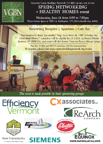 Local non-profit Vermont Green Building Network (VGBN) is excited to be hosting a Spring Networking and Healthy Homes event in Burlington on Wednesday, June 14th starting at 5pm. This event will include a networking reception with appetizers and a cash bar, and a presentation by Brian Just entitled "Step Away from the Cliff! Avoiding the Unhealthful Home." Attendees will be eligible for 1.5 CEUs via Passive House Institute US (PHIUS). The event will also feature Vermont Passive House group, and will be hosted in the beautiful Town Center space at VEIC (128 Lakeside Ave, #401).