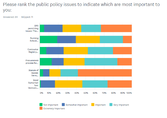 Another interesting insight came from Q5, “Please rank the public policy issues to indicate which are most important to you.” The clear winner is the Statute of Repose, with 89% of respondents identifying the issue “important, very important, or extremely important.” The Public Policy committee has been very active this year in the Contractor Licensing and DFS Permitting issues, specifically. The Contractor Registry article by Sandy Vitzthum, AIA and Sarah O Donnell in this newsletter goes into detail on the current status of the Contractor Registry bill.