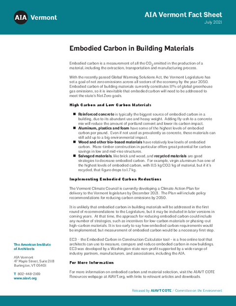 - The AIAVT COTE Fact Sheet on Embodied Carbon in Building Materials: